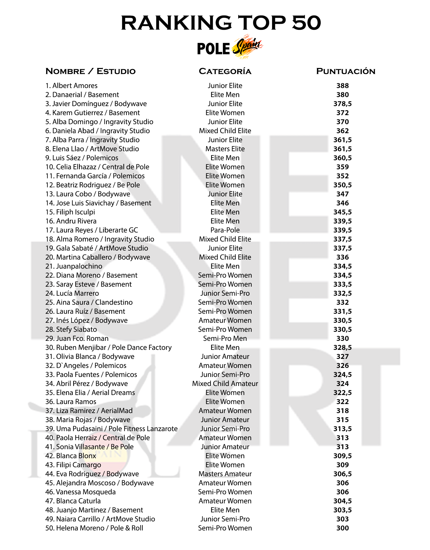 4 | Beatriz Rodríguez / Be Pole | Elite Women | 350,5 |